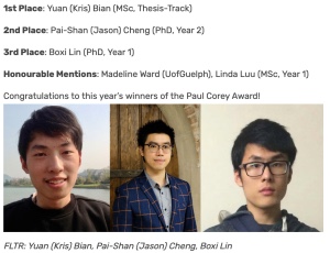 [June 2020] š„: I won the Paul Corey Award - First Place at the Southern Ontario Regional Association of the Statistical Society of Canada & Southern Ontario Chapter of the American Statistical Association Biostatistics Research Day.