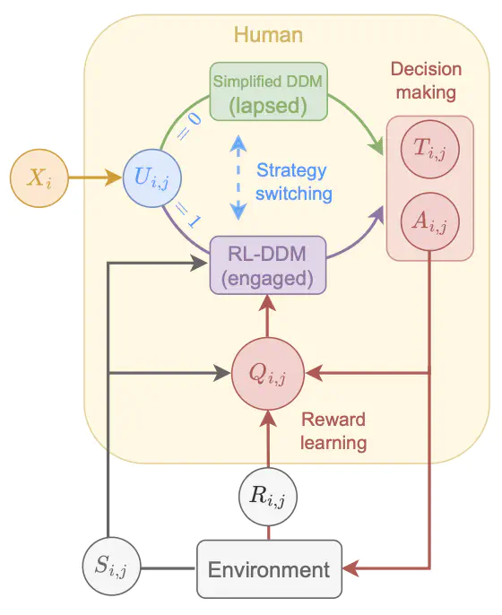 Major depressive disorder (MDD), a leading cause of disability and mortality, is associated with reward-processing abnormalities and concentration issues. Motivated by the probabilistic reward task from the Establishing Moderators and Biosignatures of Antidepressant Response in Clinical Care (EMBARC) study, we propose a novel framework that integrates the reinforcement learning (RL) model and drift-diffusion model (DDM) to jointly analyze reward-based decision-making with response times. To account for emerging evidence suggesting that decision-making may alternate between multiple interleaved strategies, we model latent state switching using a hidden Markov model (HMM). In the engaged state, decisions follow an RL-DDM, simultaneously capturing reward processing, decision dynamics, and temporal structure. In contrast, in the lapsed state, decision-making is modeled using a simplified DDM, where specific parameters are fixed to approximate random guessing with equal probability. The proposed method is implemented using a computationally efficient generalized expectation-maximization (EM) algorithm with forward-backward procedures. Through extensive numerical studies, we demonstrate that our proposed method outperforms competing approaches across various reward-generating distributions, under both strategy-switching and non-switching scenarios, as well as in the presence of input perturbations. When applied to the EMBARC study, our framework reveals that MDD patients exhibit lower overall engagement than healthy controls and experience longer decision times when they do engage. Additionally, we show that neuroimaging measures of brain activities are associated with decision-making characteristics in the engaged state but not in the lapsed state, providing evidence of brain-behavior association specific to the engaged state.